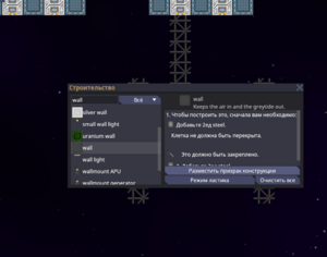 Используя заранее заготовленные ресурсы через меню строительства (G) строим обшивку шаттла.