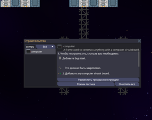 Консоль собирается как любой другой компьютер. Когда каркас компьютера построен, просто нажимаем SHIFT+ЛКМ по нему, и нам будет указано следующее действие. Когда будет указано вставить любую плату, устанавливаем в компьютер плату консоли управления шаттлом.